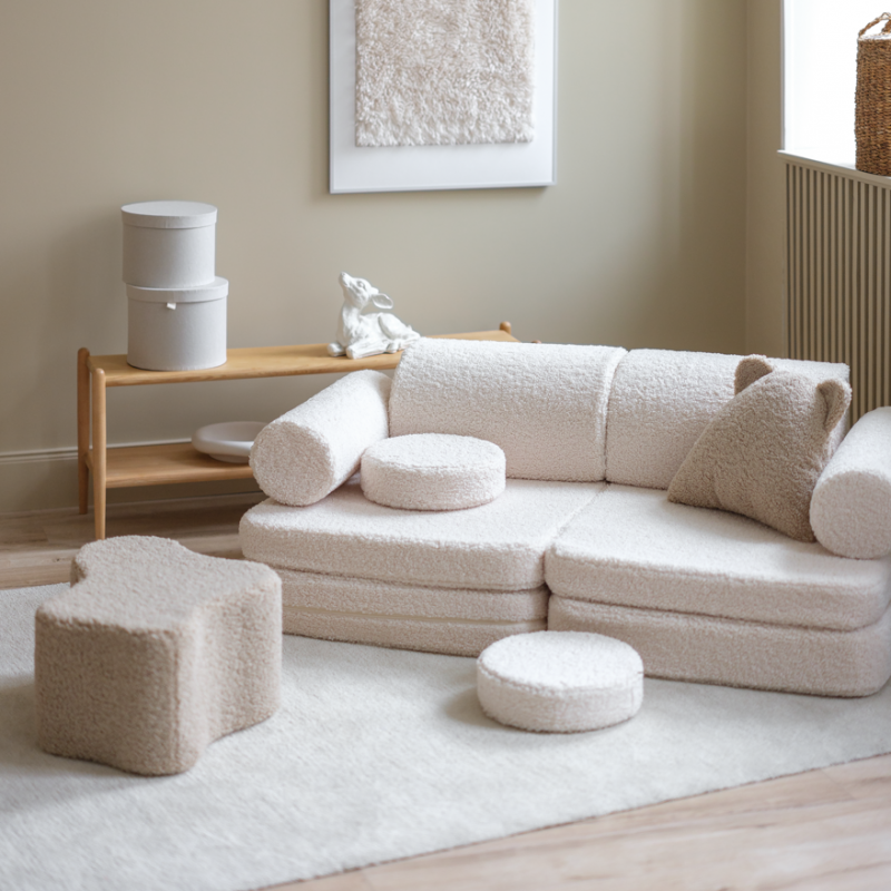 Ce petit canapé assure un maximum de confort et de soutien, tandis que la douceur de la bouclette le rend chaleureux et invitant.