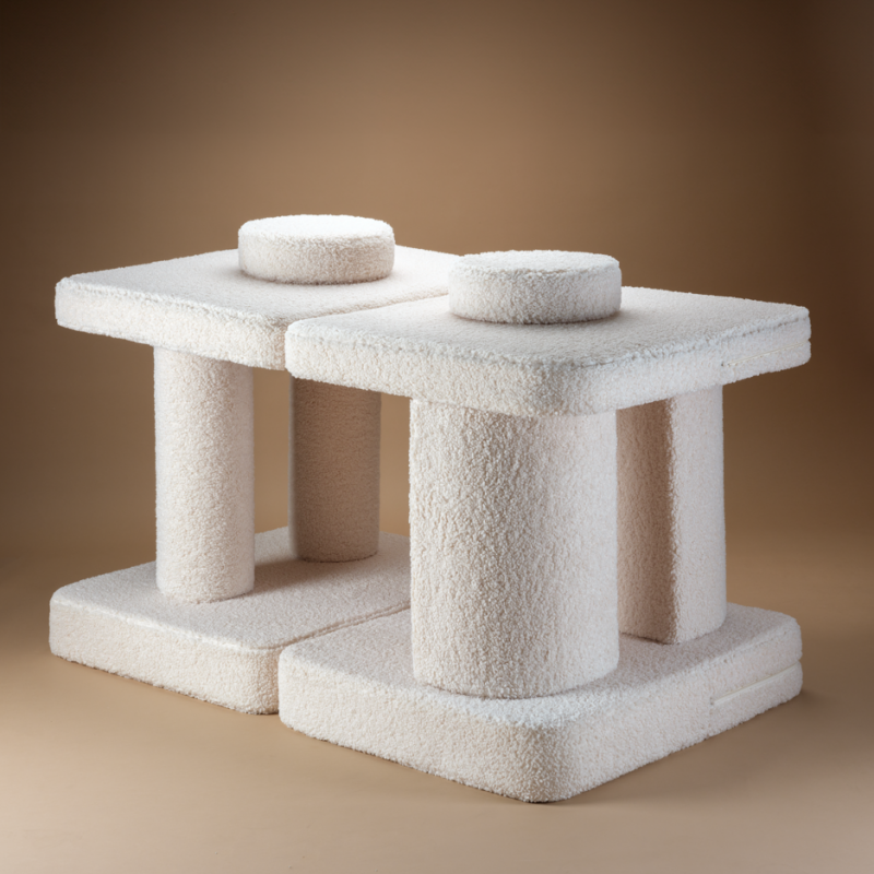 Il est composé de 9 parties: 2 coussins d'assise, 1 grand coussin d'assise, 2 coussins triangulaires comme dossiers, deux coussins comme accoudoirs et 2 coussins ronds offrant ainsi une combination parfaite avec un potentiel ilimité de jeu imaginatif et détente.