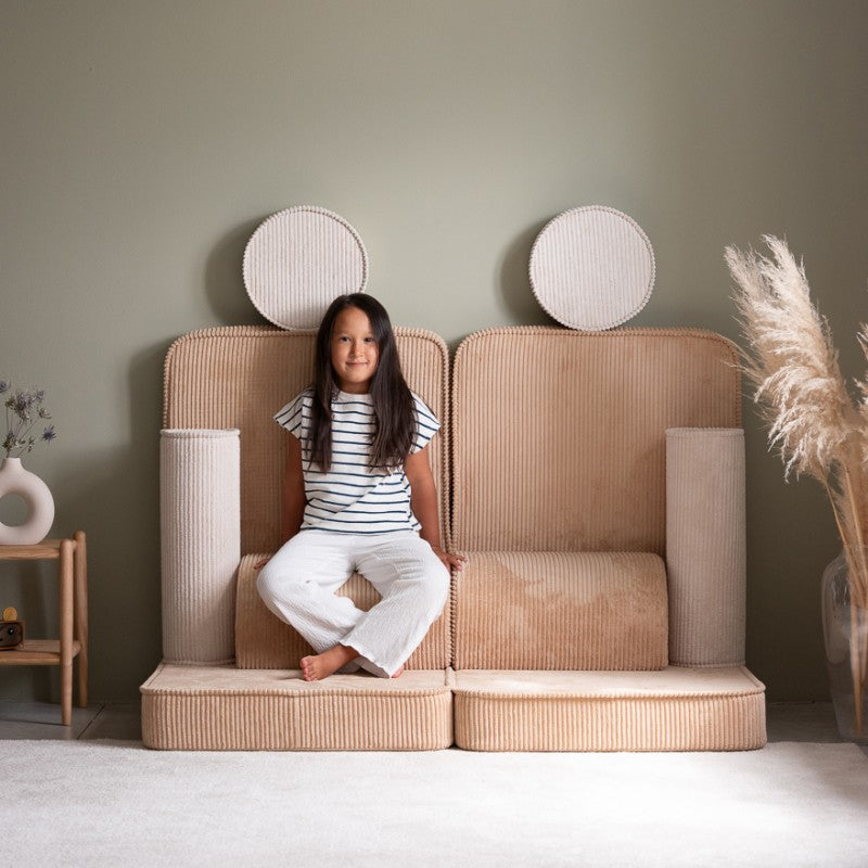Il est composé de 9 parties: 2 coussins d'assise, 1 grand coussin d'assise, 2 coussins triangulaires comme dossiers, deux coussins comme accoudoirs et 2 coussins ronds offrant ainsi une combination parfaite avec un potentiel ilimité de jeu imaginatif et détente.