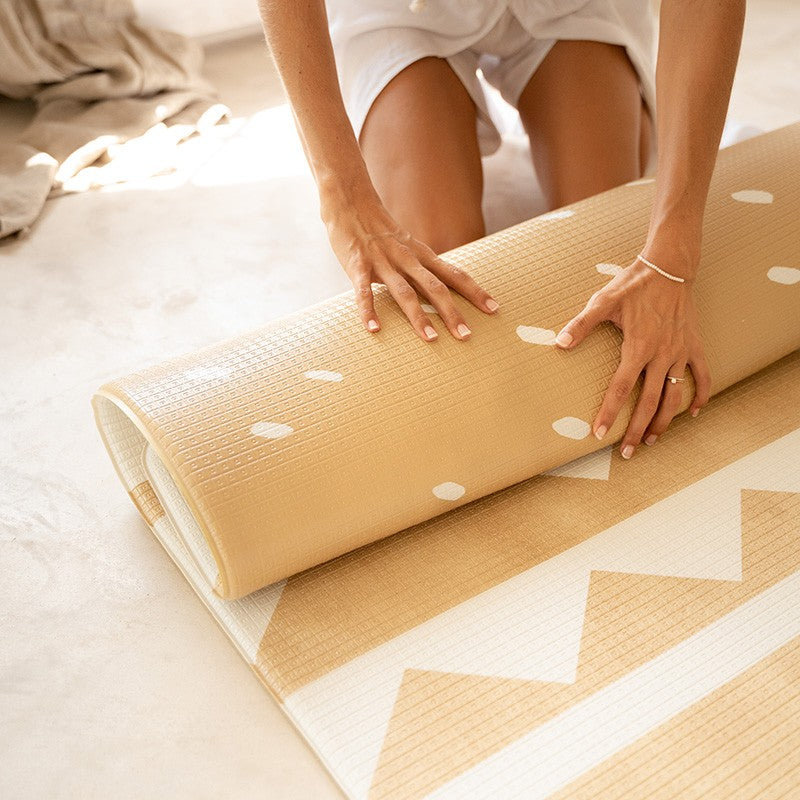 Découvrez le tapis de jeu réversible TRIBECA WHEAT pour protéger votre petit de ses culbutes quotidiennes tout en étant chic dans votre maison. Un tapis Toodlekind !