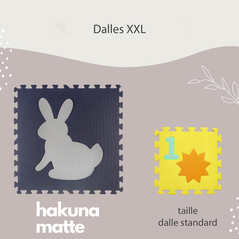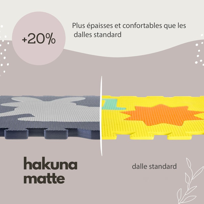 Ce tapis est épais de 1.2 cm et composé de 9 dalles XL en mousse à assembler soi-même.