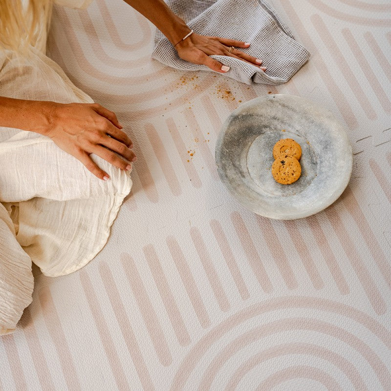 Le tapis en mousse premium LINEAR PUZZLEMAT LINEN est conçu avec un doux beige. Ce tapis de jeu offre un look léger et élégant. Un tapis TODDLEKIND.