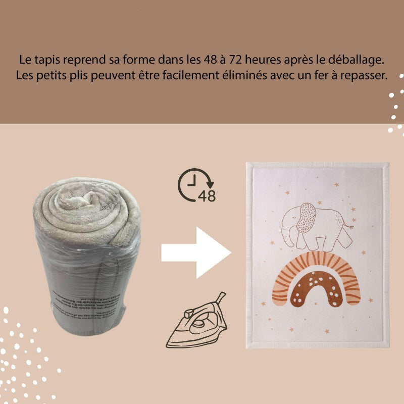 Découvrez CLOUD RAINBOW, et apportez une touche de douceur à la chambre de votre enfant avec le tapis 'Rainbow', orné d'un éléphant rêveur et d'un arc-en-ciel aux tons apaisants, parfait pour éveiller leur imagination.
